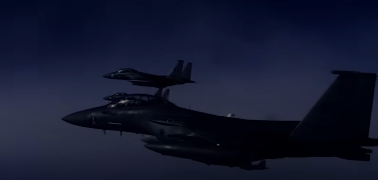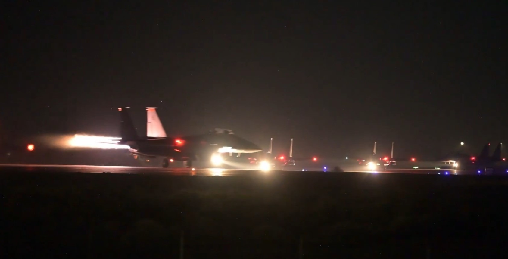 미군의 주력 전폭기 F-15E 스트라이크 이글 전폭기가 애프터버너의 불꽃을