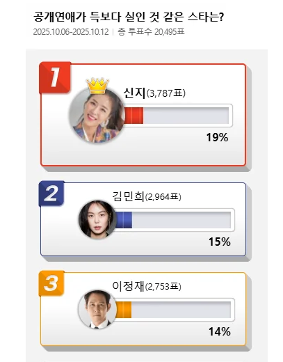 공개 연애가 스타에게 반드시 득이 되지는 않는다는 인식이 다시 한번 확인됐다. 최근 디시인사이드가 진행한 설문조사에서 신지, 김민희, 이정재가 ‘공개 연애가 득보다 실인 것 같은 스타’ 상위권에 이름을 올렸다.
